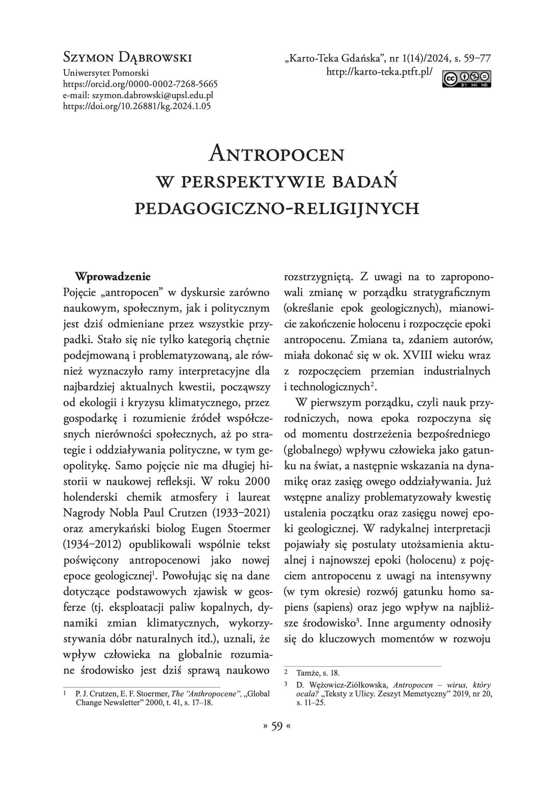 Dąbrowski (2024), Antropocen w perspektywie badań pedagogiczno-religijnych, „Karto-Teka Gdańska”, nr 1(14)/2024, s. 59‒77.